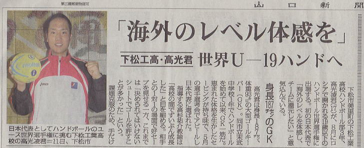 平成27年度世界大会U−19ハンドボール初の日本代表に選抜された 高光凌君