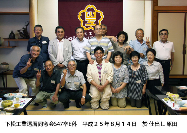 | 電気科39年卒 同窓会 日 時 : 10月29日(土) 場 所 : 下松市 「升吉」 参加者 : 13名 E39同窓会を10月29日、 「升吉」で開催し、13名の仲間と楽しく過ごしました。 その時の出席者の皆さんから、体調不良や種々の理由から出席できなかった方とも、是非会いたかった との声があり、次回は、体調を整え是非出席を頂きたいと思い、2年後の平成30年秋の再会を約束しま した。 ![]() |
