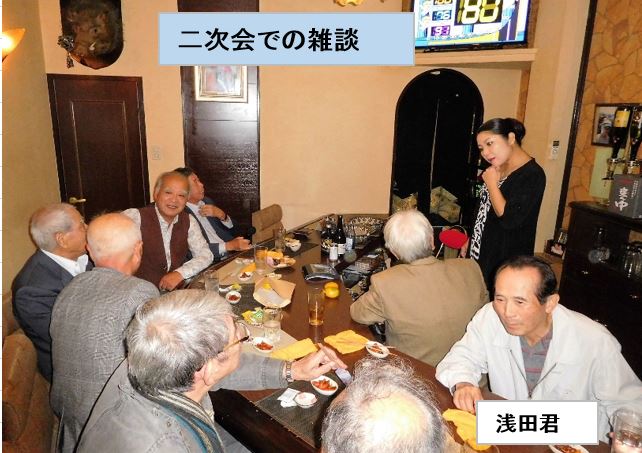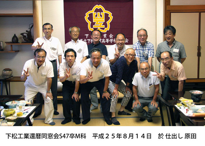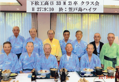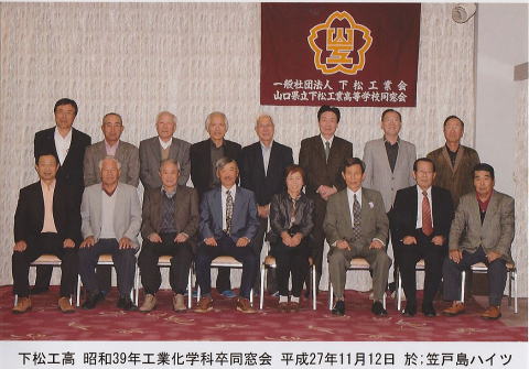 | 機械科35年卒 同窓会 日 時 : 10月27日(木) 場 所 : 下松市 「升吉」 参加者 : 13名 下松ステーションホテル内の升吉で、昭和35年定時制機械科卒、第7回同窓会が開催された。 第6回同窓会(2014年)から2年、卒業以来56年ぶりという仲間2人(浅田君、黒木君)が 初めて参加、お互いの昔話、苦労話で予定時間はあっという間に過ぎ去りました。その後、 二次会でカラオケを歌い、和やかな雰囲気のうちに再会を約束してお開きとなった。 |